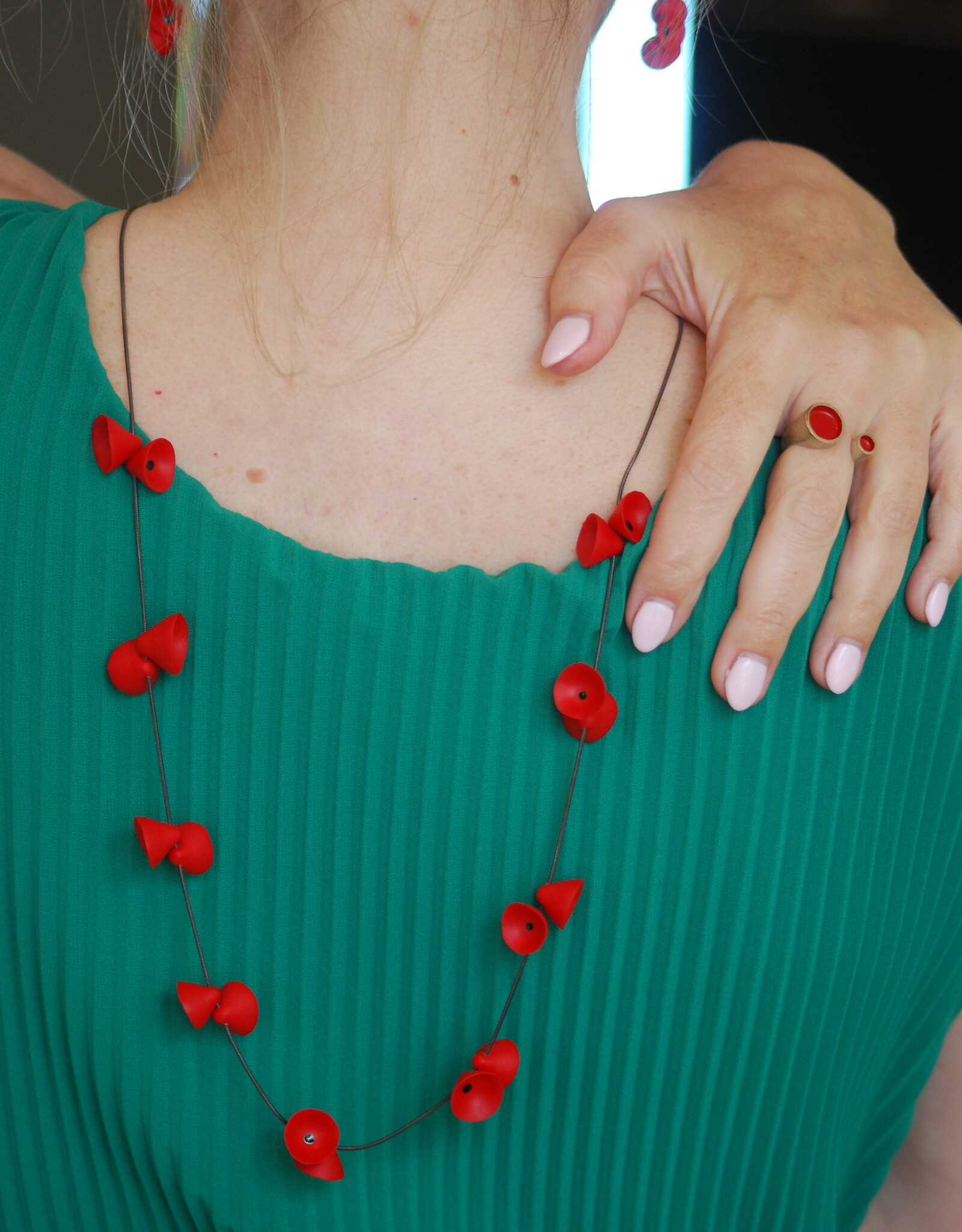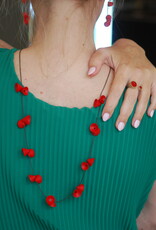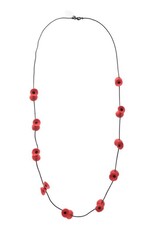 Een zeer elegante collier met klaproosjes. De klaproosjes zijn gemaakt van koud emaille en stralen een zeer speels karakter uit. De ketting is gemaakt van zilver, deze is geoxideerd waardoor hij deze zwarte kleur heeft. Het zwart van de ketting en het rode van de klaproosjes steken zeer fijn af tegenover elkaar.